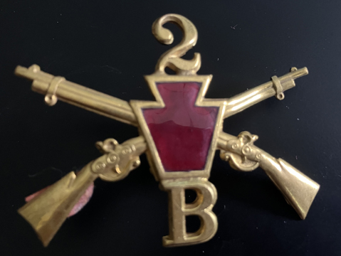 Gilt crossed rifles with red enameled keystone in the center, "2" above and "B" below. Laframboise Vol. I pg. 153, fig. 49. Screwpost back. See note above. | SALE $ 18.00 | |