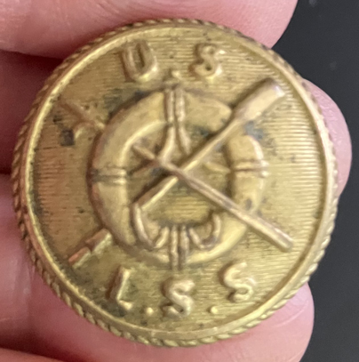 A gilt coat button of life ring with crossed oar and hook.Slightly domed with letters "U.S.L.S.S." on front, "E.A. Armstrong, Detroit" on back, with rope edge. Fixed shank. Circa early 1900's. Approximately 1" in diameter. | SALE $30.00 |