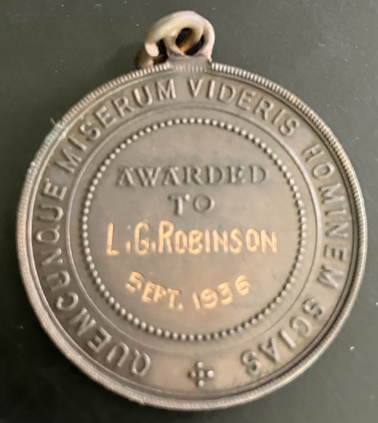 Bronze medal, awarded for proficiency in life saving skills and knowledge. The Roayl Life Saving Society was established in 1891. This medal was awarded to "L.G. Robinson Sept. 1936." Approximately 1-1/5" in diameter. | SALE $35.00 |