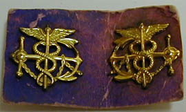 As worn by surgeons and other personnel in the Marine hospital. A horizontal fouled anchor with caduceus centered. Gilt brass, clutch back. Sold singly. | One SOLD SALE $20.00 |