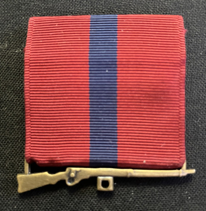 Red ribbon with blue stripe down center, integral top brooch bar, with rifle hanging from bottom of ribbon. Bar has "GI"Missing medal. |