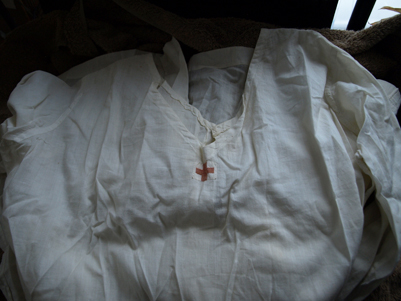 cross insignia on front neckline. Hemmed with one pocket on front. Stained on the front.