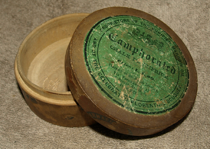 Wooden container almost 3" in diameter, 1 3/8" high. Green label with "Camphorated Chalk Dentifrice" (tooth powder). Also "Proprietors of the Purified Marrow Oil and of the Celebrated Florentine Bouquet.: "Price: L.4.00 Pharmacy of the British ??Legaland via Tornabaoni, 17 & Piazzo Marnin, 2 Florence".