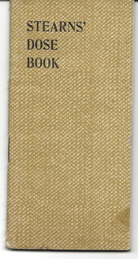 "Stearns' Dose Book: A Key to the U.S. Pharmacopeia and Handy Manual of Useful Information Pertaining to Medicine." Approximately 2-7/8" x 5-5/8" overall. 88 pages and heavy paper covers. From a World War I Army Surgeon's lot. In great condition.