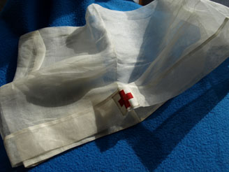 with faded red cross insignia on front edge. Hemmed. Stained.