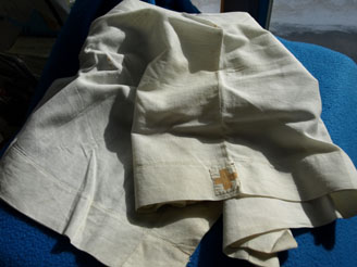 cross insignia on front edge. Hemmed. Approximately 20" x25" overall.