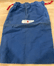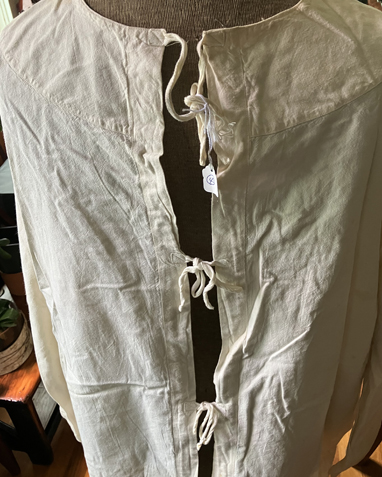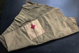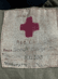 Linen surgical gown, with red cross on the front pocket and three tie closures in the back. Has faded blood spots on gown. Long Sleeved. |