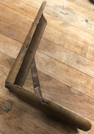 Made of maple with brass cross piece. Red leather straps. Not labeled by Day but identical to other splints that we have that are marked day. |