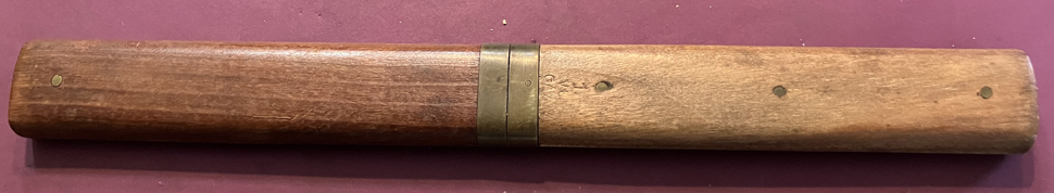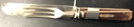 Fork and knife slide together into wooden handles to make one unit. Fork is three tine, both knife and fork steel. They are attached to handles with three brass rivets. Brass bound edge on fork handle is marked "1 Vt. Cav." Approximately 8" long. | SALE $ 125.00 |