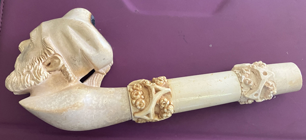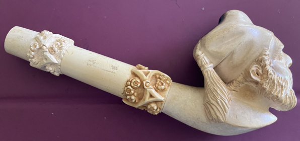 Hand-carved meerschaum pipe of a Zouave soldier. Bowl and stem are all meerschaum (three part screwed together). Typical headgear and large beard for Zouaves. Bowl shows black staining from use. There is a crack on hat but does not go through to bowl. Zouaves were popular Union soldiers during the Civil War and known for their distinctive uniforms. |