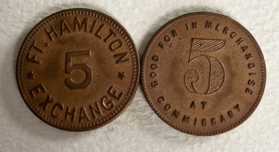 Marked "Ft. Hamilton Exchange" with a 5 on one side and "Good For In Merchandise at Commissary" on the other. Fort Hamilton is NYC's only US Military Base. | SALE $10.00 Each |