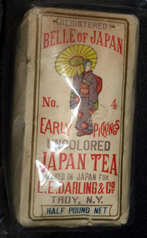 Half pound package of "Registered Belle of Japan No. 4 Early Pickings Uncolored Japan Tea". "Packed in Japan for E.E. Darling & Co. Troy, N.Y. Half Pound Net." Back of packaging has instructions for brewing. E.E. Darling & Co. were wholesale grocers in Troy at the time. Excellent, unopened condition...some cracks to outer paper packaging but no tea leaking from these tears. | SALE $24.00 |