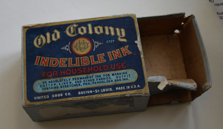 "Old Colony Indelible Ink for Household Use"...United Drug Co. Boston-St. Louis Made in U.S.A. Absolutely Permanent ink, for marking cotton, linen, and other fabrics. Outfit contains stretcher, pen, penholder and ink. Approx. 2 1/4" x 3 1/4" overall...inner box is in poor condition. | SALE $12.00 | |