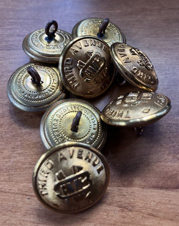 Brass uniform buttons for the Third Avenue Railroad (NYC). Pre-1898. Marked on back "Superior Quality Made in England. Eleven buttons in lot total. Third Avenue took over the Union Railway Co. in 1912. | S$50.00 | |