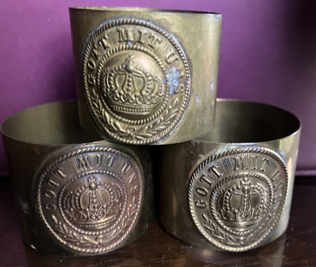 Has "Gott Mitt Uns" belt buckle emblem. Brass, two are 1-9/10" in diameter, other is 1-7/10" in diameter. Sold separately. | SALE $35.00 each |