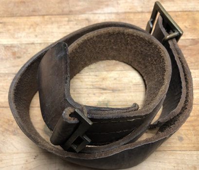 Leather Army waist belt to hand equipment from. Open frame buckle with "C" catch. Stamped with "Armes Belse?" Marked inside with ....Sal. Vasta......" and other info that is hard to make out. Also inititals "S.V." | SALE $30.00 | |