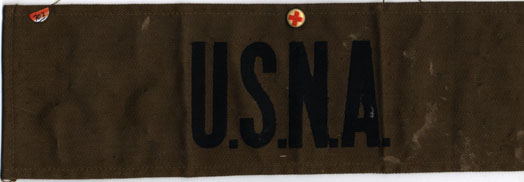 Marked "USNA" for US National Army (as opposed to Regular Army). These were issued to inductees when they left by train to go to their training camps (where they were issued their full uniform.) Has small red cross pin on it. Olive drab cloth with black block lettering. | SALE $24.00 |