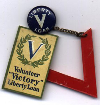 Small blue celluloid pin button with paper "Volunteer "Victory" Liberty Loan paper attachment and plastic "V" hanging from button. | SALE $24.00 |