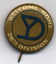Celluloid button, marked "Welcome Home 26th Division" with symbol of interlocking YD for "Yankee Division" (nickname for Massachusetts group). | SALE $12.00 |