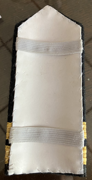 Black felt base with gold braid. Approximately 5-1/2" long by 2-3/10" wide. |