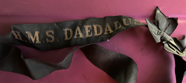 World War I, for the H.M.S. Daedalus. Black silk . Approximately 1-1/10" wide with 1/2" black letters of faded gilt thread letters. |