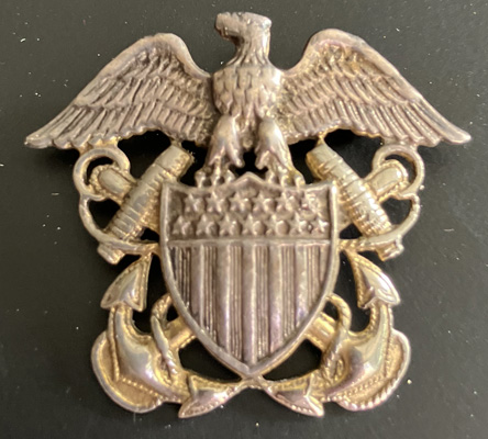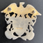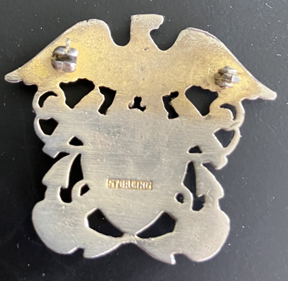 Eagle, shield and crossed fouled anchors. Marked "Sterling" on the back. See image back for missing part of pin. Approximately 1-1/5" wide by 1-1/10" high. |