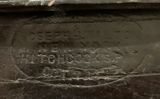 Leather side-break lid cartridge box with two belt loops. Has wooden inset (appears handmade)- missing cardboard insert. Manufactured by Joseph J. Walton New York Hitchcock's Patent Oct. 7 1889. |