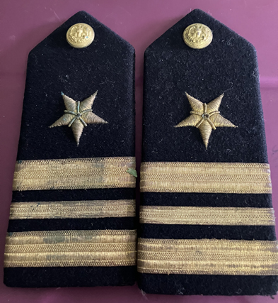 Circa 1960's, gold bullion star and braid (three stripes) with naval buttons. Back has leather straps with snaps (says "United Carr"). A pair. |