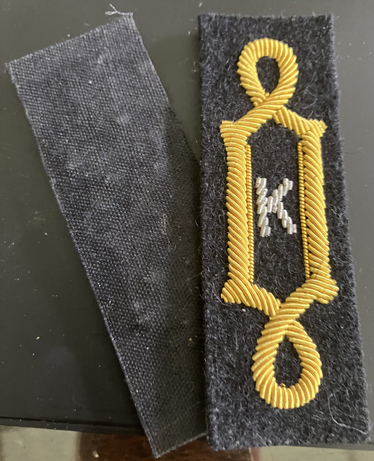 A reproduction woven epaulette with gold braid and silver bullion letter "K". Approximately 1" x 3" overall. A pair. |