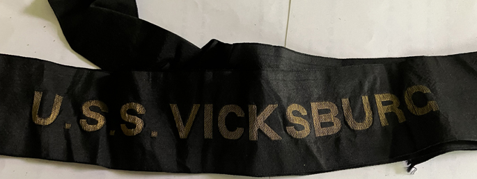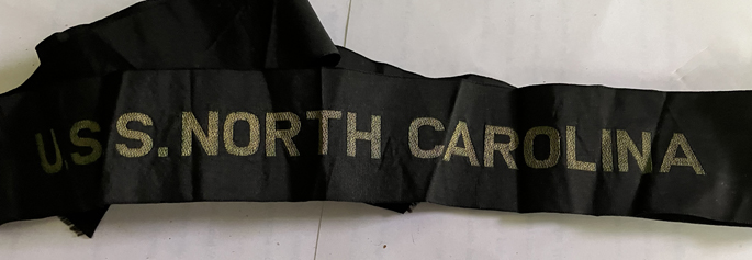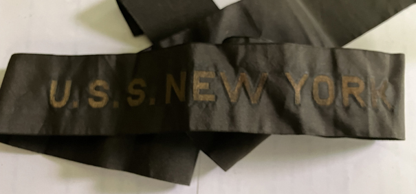 Belonged to William Gantsz, a relative of my father JNJ, who served from 1896 to 1920 in the U.S. Navy. Black silk with gold bullion letters. 1-1/2" wide with 1/2" block letters. Full length. |