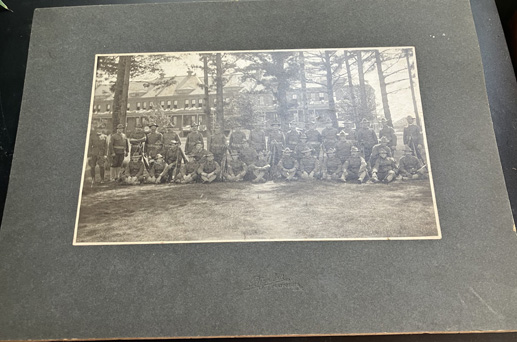 Circa 1902, large period photograph of a company of U.S. Infantry. Taken at Plattsburg (NY) Barracks with one of the old brick barrack buildings in the background. Has officers, NCO's and privates in three ranks with their stacked rifles. Also shows bed linens, mattresses etc. handing out the second story window and on the roof to the porch. Approximately 10x 13-1/2" overall. | SALE $28.00 |