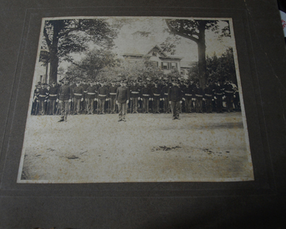 Image approximately 7.5" x 8.75", overall 11 x 14". Shows a company of U.S. Infantry, circa 1902 on the parade ground of a fort. The enlistedmen all have rifles while the officers have swords. Some civilians visible off to the sides. | SALE $ 28.00 |
