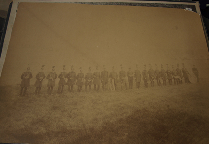 Shows a Civil War Period Military Band wearing triple breasted frock coats, the high crown early shakos with feathered plumes. They all hold their instruments. Image approximately 9.75 x 13" overall. Top right corner missing and one spot along right side but does not affect the image. | SALE $ 35.00 |