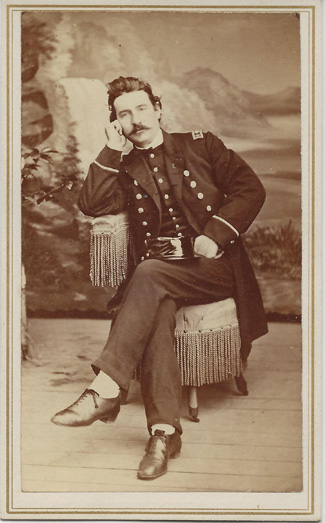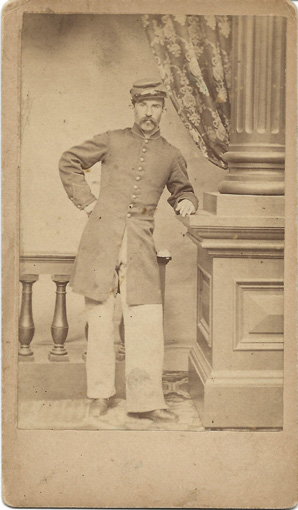Standing, studio portrait in frock coat and kepie. Can't make out insignia on top of kepie. Has an inked "N.H." on the back. | SALE $65.00 | |