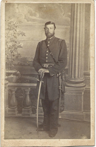 Studio portrait "From T.H. Schleiers Photographic Gallery Cor. Cherry and Union Streets, Nashville, Tenn." Leaning on his sword with scabbard at his side, eagle belt buckle, appears to be one star on his shoulder strap (?). Two tassels visible to right of scabbard. |