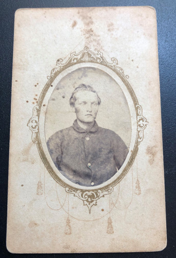 Gem size tin-type, mounted in a cartes de visite frame with embossed motif around the opening. He wears double coat with double row of buttons and has shoulder straps. | SALE $55.00 | |