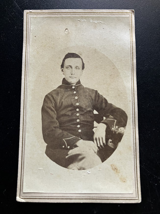 Marked "Maj. Haswauld Mass" in pencil on back but do not know if accurate. "A.F. Daniels, Photographer, 197 Main St. Worcester, MA" backmark. Has green 3cent stamp on back. Marks on paper but not within oval of the image of seated soldier. | SALE $55.00 | |