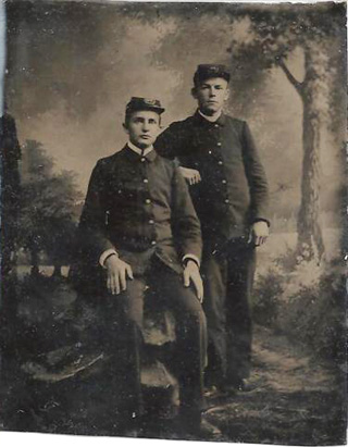 Tintype (Ferrotype) of two U.S. Army Hospital Stewards with "US" in wreath on their kepis. A studio portrait, they are wearing five button jackets. approximately 2-1/2" x 3-1/2" overall. | S $ 65.00 |