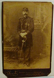 Circa 1875-1880. He is wearing the frock coat with three gold tabs on each cuff, a N.Y. belt and buckle and a kepie with crossed rifles and "74" above. He leans on his saber.Has aStuart, Buffalo, NY photographers laddress at bottom. Missing top & lower right corner of board but does not affect image. | S$12.00 |