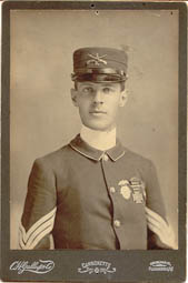 Shows a sergeant of the 1st N.Y. Inf. Co. K. He wears the five button blouse with piped collar and sergeant chevron. He also has three N.Y. National Guard medals/ Has model 1894 garrison cap with crossed rifles, "1" above and "K" below. Taken in Poughkeepsie, N.Y. | S $35.00 |