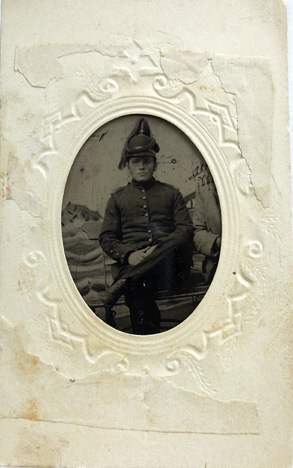 Tin type (ferrotype) of a Cavalry Trooper. Shows a full length seated pose. He wears the 1881 Dress Uniform withe plumed helmet and a triple braided hat cord. The helmet is worn backwards. Painted back drop. Approximately 2-1/2" x 4" overall with paper frame. | S $ 45.00 |