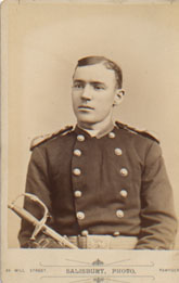 He wears the Model 1880 dress jacket with full red collar and red shoulder straps. Taken in Clinton, Mass. by Helmold, 61 Mechanic Street. $ 30.00