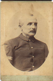 He wears a blue jacket with herringbone braid frogging, sergeants chevrons and shoulder knots. He has seven medals on his chest, a sword belt with eagle buckle and he holds his NCO sword. Taken by Ritz of Boston, it has an 1881 date in the label. $ 30.00