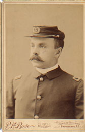 He wears the five button jacket with eagle shoulder straps. He wears his kepie with "RI" wreath insignia on the front. Taken by P.H. Rosen of Providence, R.I., it has an 1886 date in label. $ 35.00