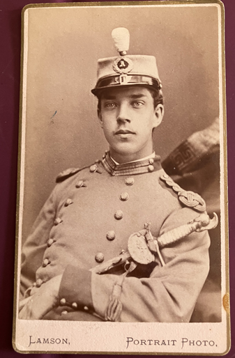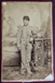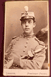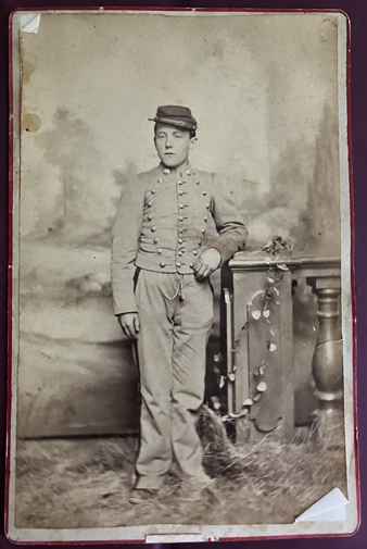 Studio portrait, he wears a grey uniform and whlue kepie. Taken by H.B. Pyne Lousiville, Ky. Also has backmark for Capitol Art Gallery, H.G. Mattern, Frankfort, Ky. Written in ink on back "this you see and dont forget our days at K.M.I. Kill Many Indians." Image lifting from carboard backing. Lowe left corner of image missing, upper right corner has a fold. SALE $20.00