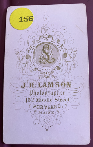 Shows him in uniform, cradlinghis sword. Wears his kepi with shako and "A" wreath insignia. Taken by" J.H. Lamson Photographer 152 Middle Street Portland, MA." SALE $35.00