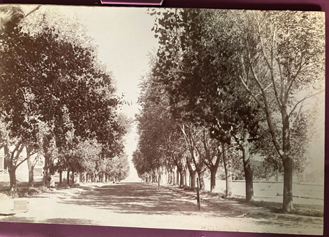 Labeled on back "Fort Grant Officer's Lane View from Administration Building". Shows tree lined lane with building to the left behind the trees and fencing (?) to the right in the field. Approximately 5-1/5" x 7-9/10" overall. Came from the Schaeffer Collection of Western Photography. SALE $40.00