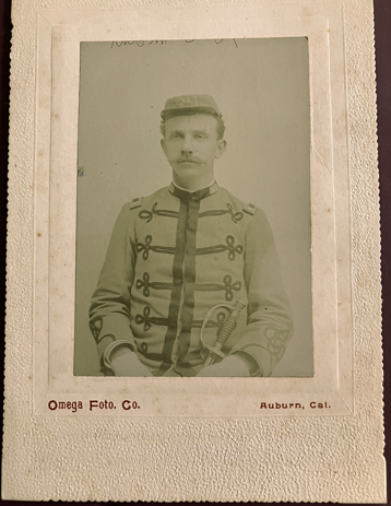 A California National Guard Lieutenant, he wears the undress officer's five button jacket with officer frogging (both of light blue or grey wool). He holds his sword in his left hand (only hilt visible). Approximately 4-1/4" x 6" overall, is is from the "Omega Foto Co. Auburn, Cal." SALE $20.00