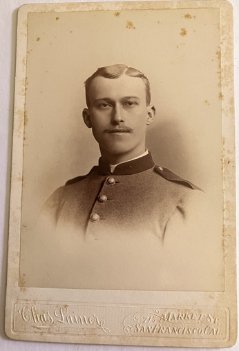Enlistdman, he wears his dress uniform jacket with California buttons. Taken by "Chas. Lainer 715 Market St. San Francisco, Cal." Circa 1880's. SALE $25.00
