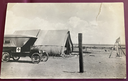 Shows an ambulance with red cross on door in front of a tent. There is an American flag and a Red Cross flag to the right of the image as well. Marked on back "Cavalry Field Hospital" in browned ink. Has tear to upper right corner of sky. | SALE $6.00 |